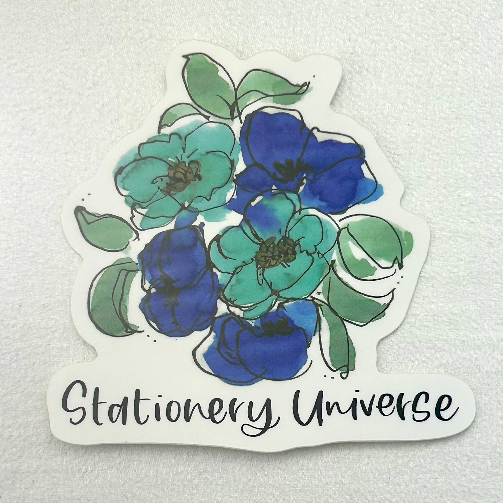 Add a burst of color anywhere you fancy with this playful sticker by From Carola. It features one of her signature hand-painted floral bouquet created with fountain pen inks. Composed of generous inky splashes and organic line drawings, the bright teal and celestial blue blossoms come to life above the charming hand-lettered “Stationery Universe.”