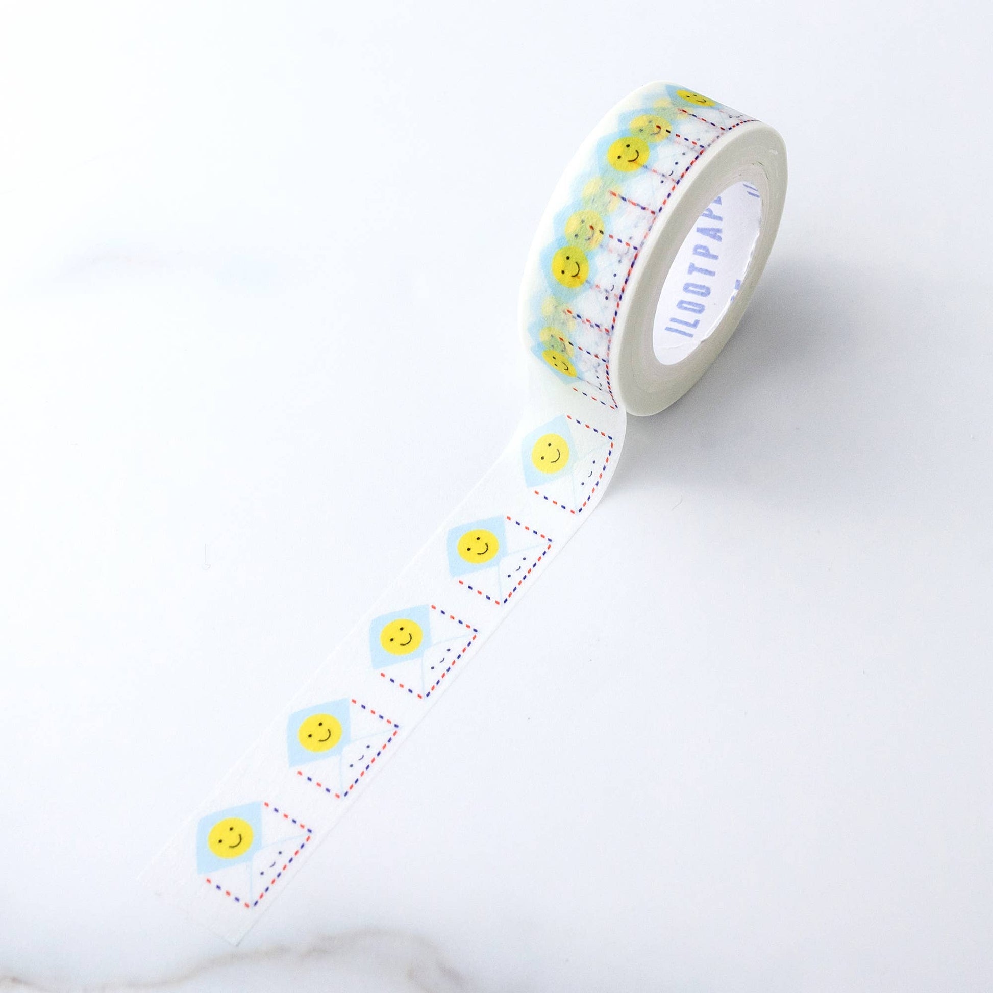 Spread sunshine on your snail mail, journals, gifts, and envelopes with Happy Face Envelopes Washi Tape! Made from natural fibers, this semi-translucent paper tape features original cheerful illustrations of cheerful faces peeking out of envelopes. Measuring 15mm wide by 32 feet long, it’s perfect for sharing happiness.