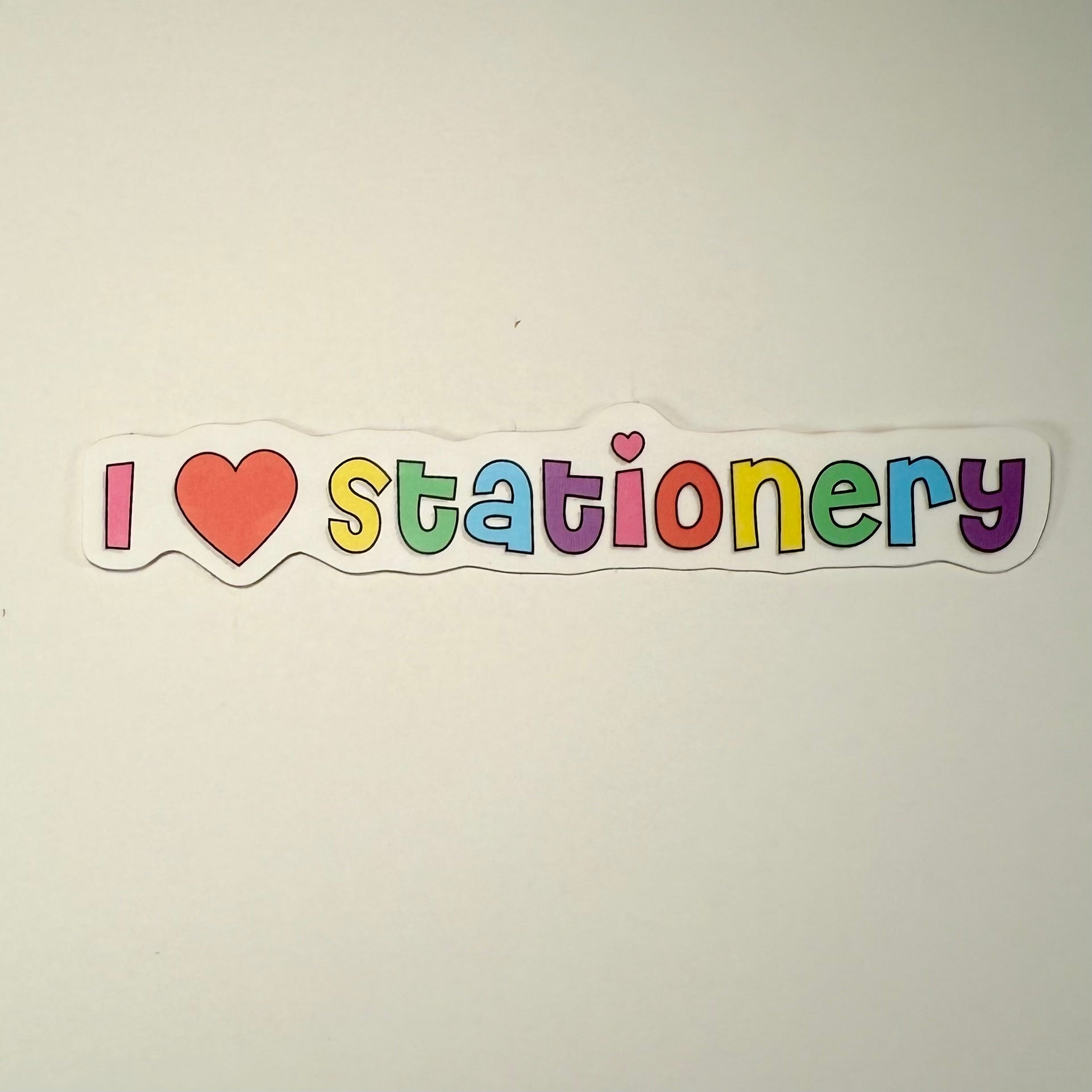Brighten up your notebooks, laptops, or planners with this playful "I ♡ stationery" sticker. Featuring bubbly rainbow letters, it's the perfect way to show your love for all things pens and paper with a fun, colorful statement.