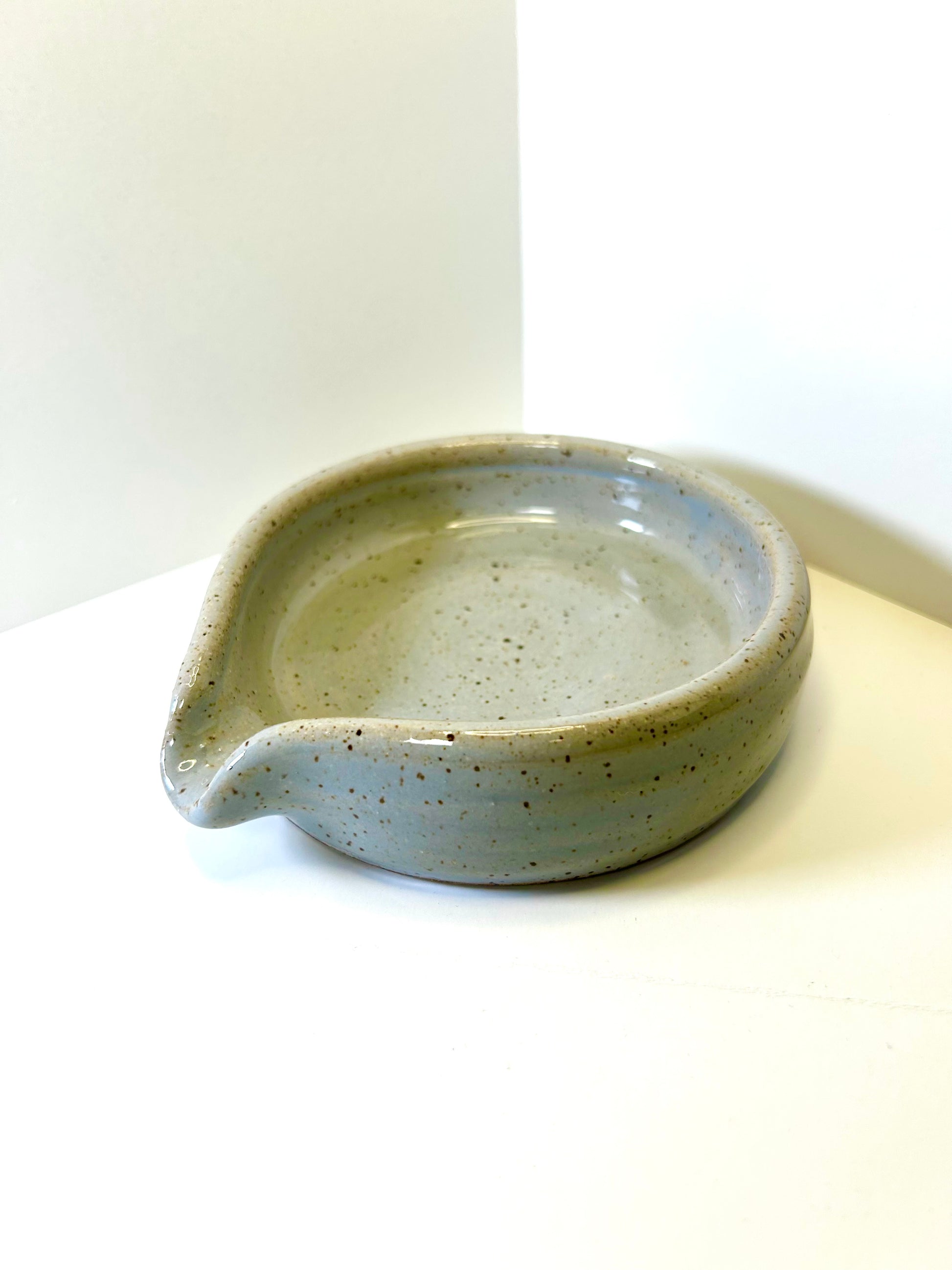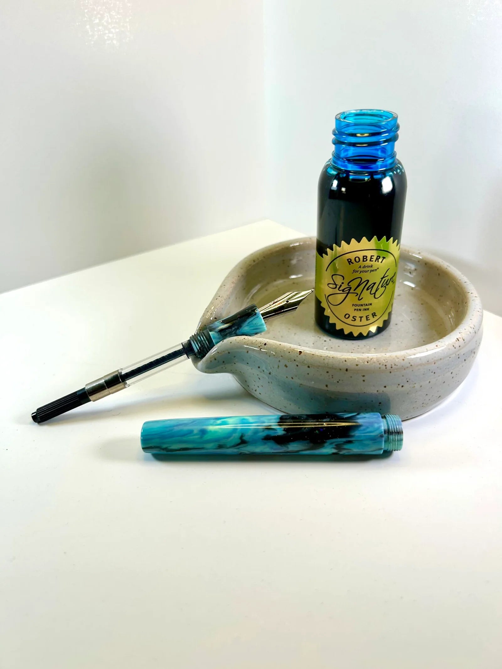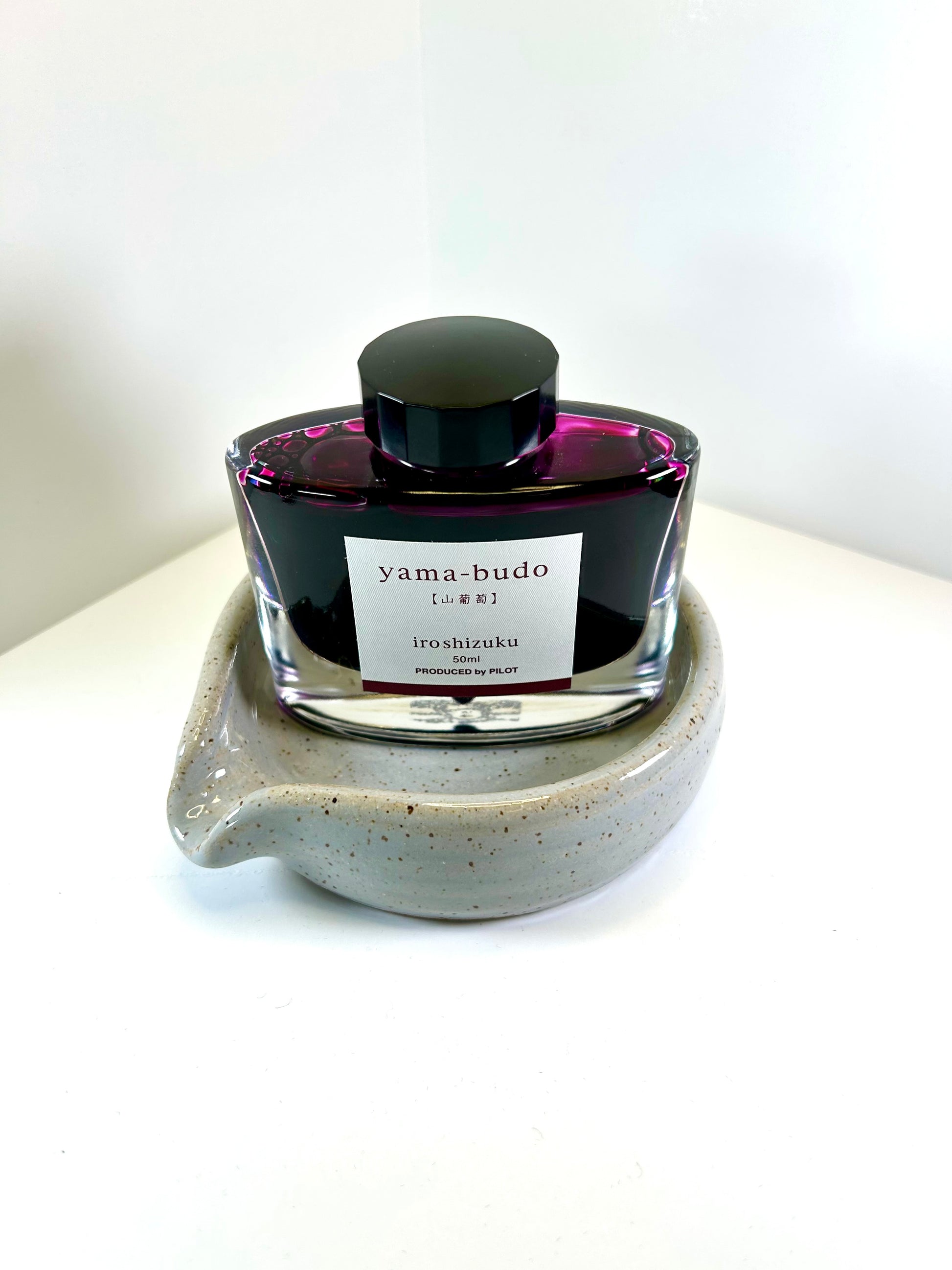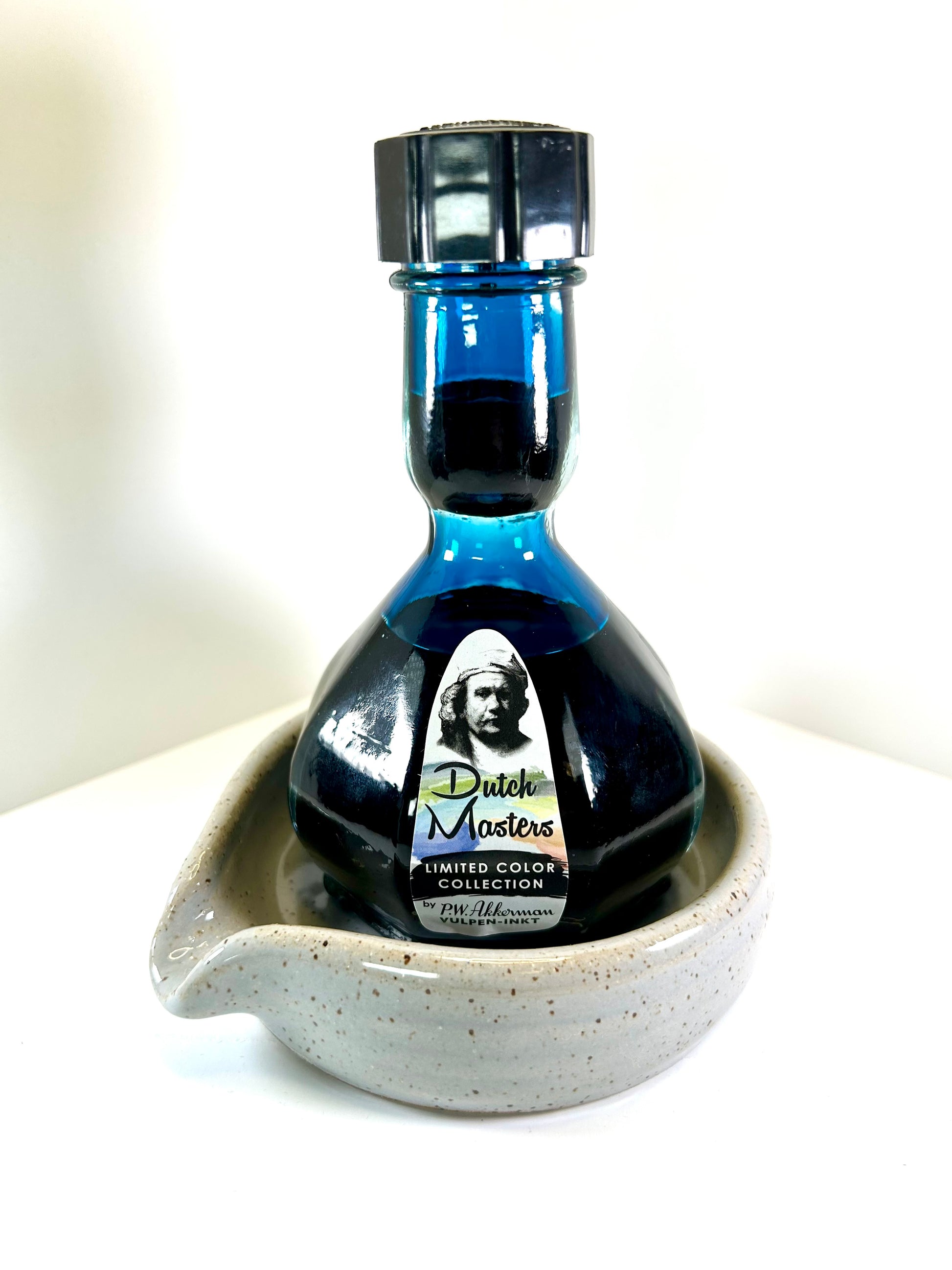 Each InkWell is a one-of-a-kind, hand thrown ceramic piece exclusively made for Stationery Universe by Gina Desantis Ceramics in Cleveland, Ohio. They feature a light grey speckled glaze with a glossy finish, so ink can wipe right off. InkWells can accommodate ink bottles of all shapes all sizes — even the super big Dutch Masters Akkerman bottle nestles nicely in its curves!