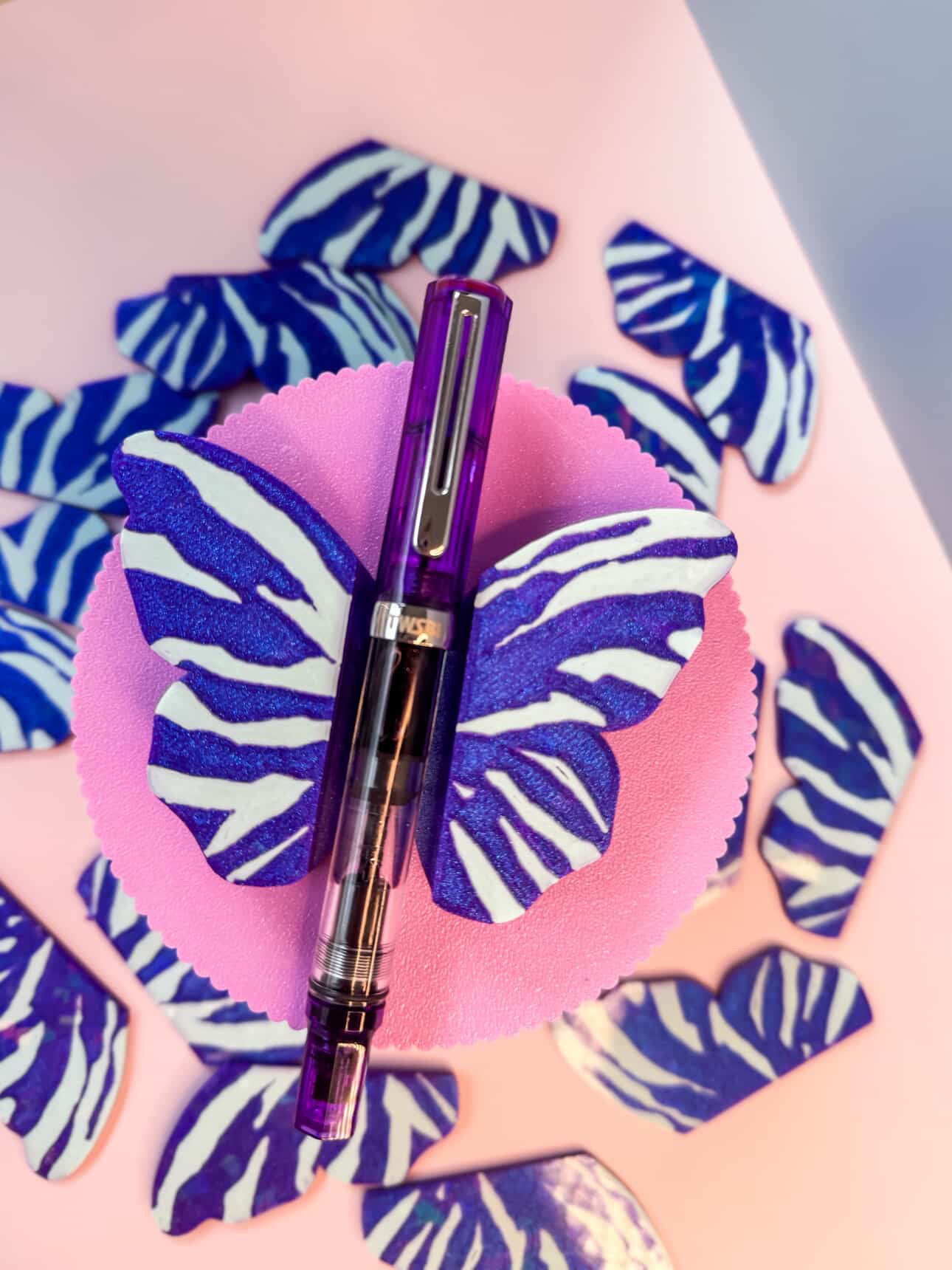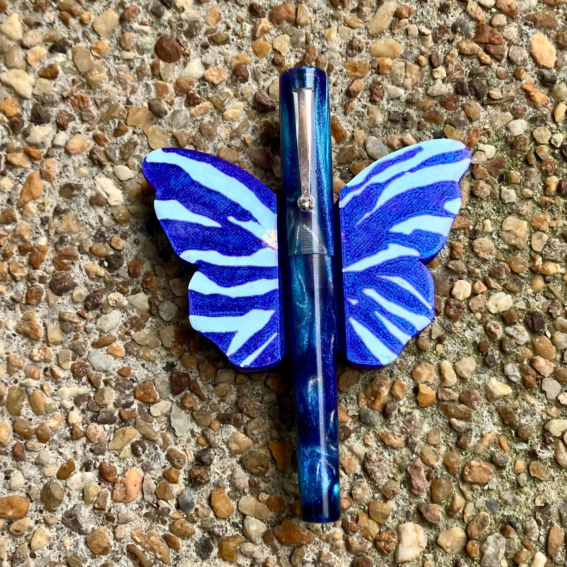 Introducing the Morpho Rest, a whimsical collaboration between Stationery Universe and Kaleidocraft Prints. Each stunning butterfly shaped pen rest is 3D printed and hand assembled, with sparkly purple magically interplaying with iridescent light turquoise. It is designed to hold a fountain pen in between the wings. Each rest is 2.8" x 4.2".