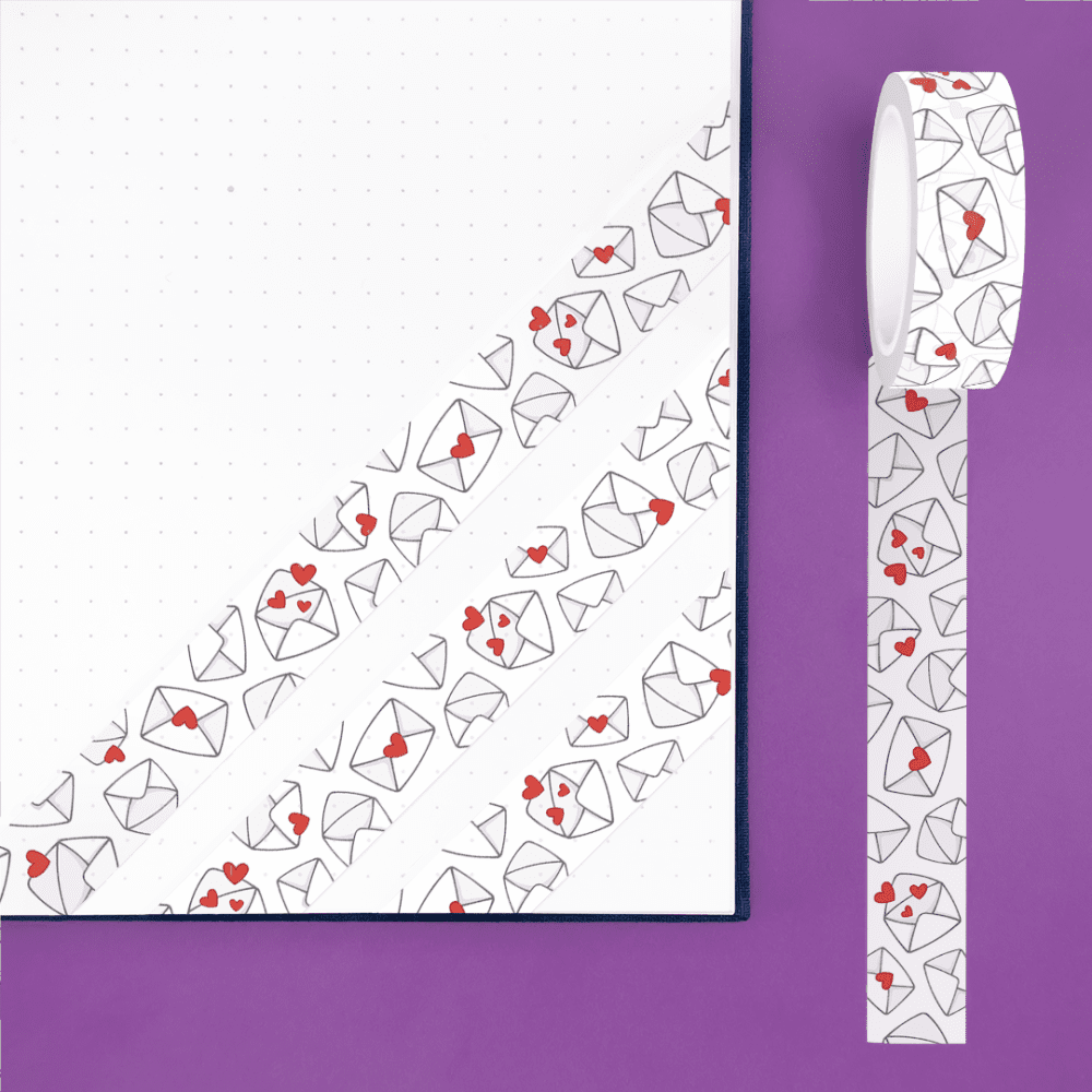Whether you're sending love by mail or journaling and day dreaming, what better way to seal the sentiment than with a kiss. This sweet washi features cheerful envelopes dancing along with little hearts. Each extra long roll is 32 feet long and ½ inch wide, and designed by Oops a Daisy.