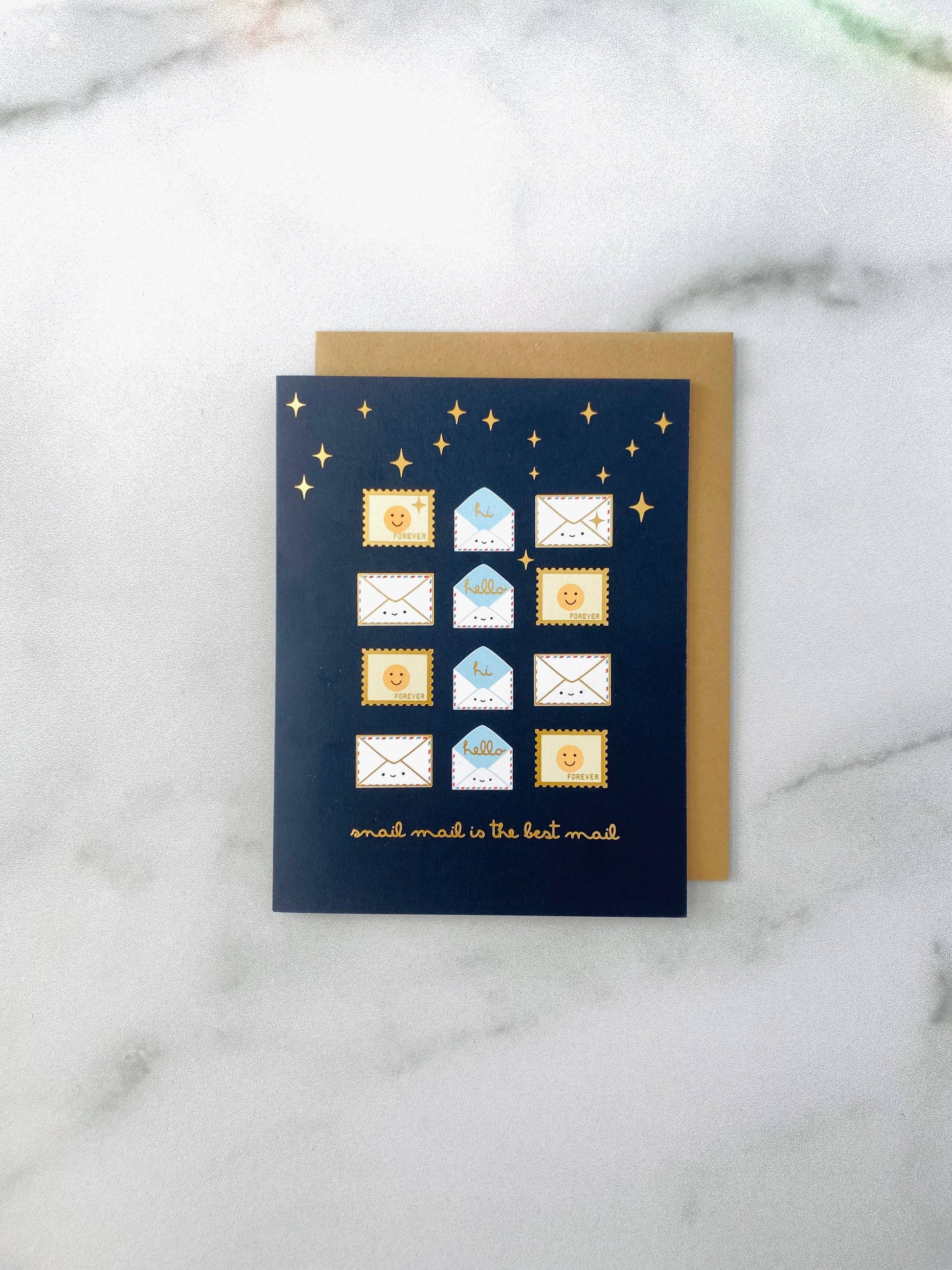 Celebrate the joy of handwritten notes with this playful "Snail Mail is the Best Mail" card. Printed with rich Indigo Press on crisp arctic white linen-textured cardstock, it features shimmering gold foil stars that pop against a dark sky, hanging above constellations of cheerful envelopes. Sized at 4.25" x 5.5", it fits perfectly in the included high-quality tan envelope with a chic Euro flap. Spread smiles the old-fashioned way with a card as charming as your message!