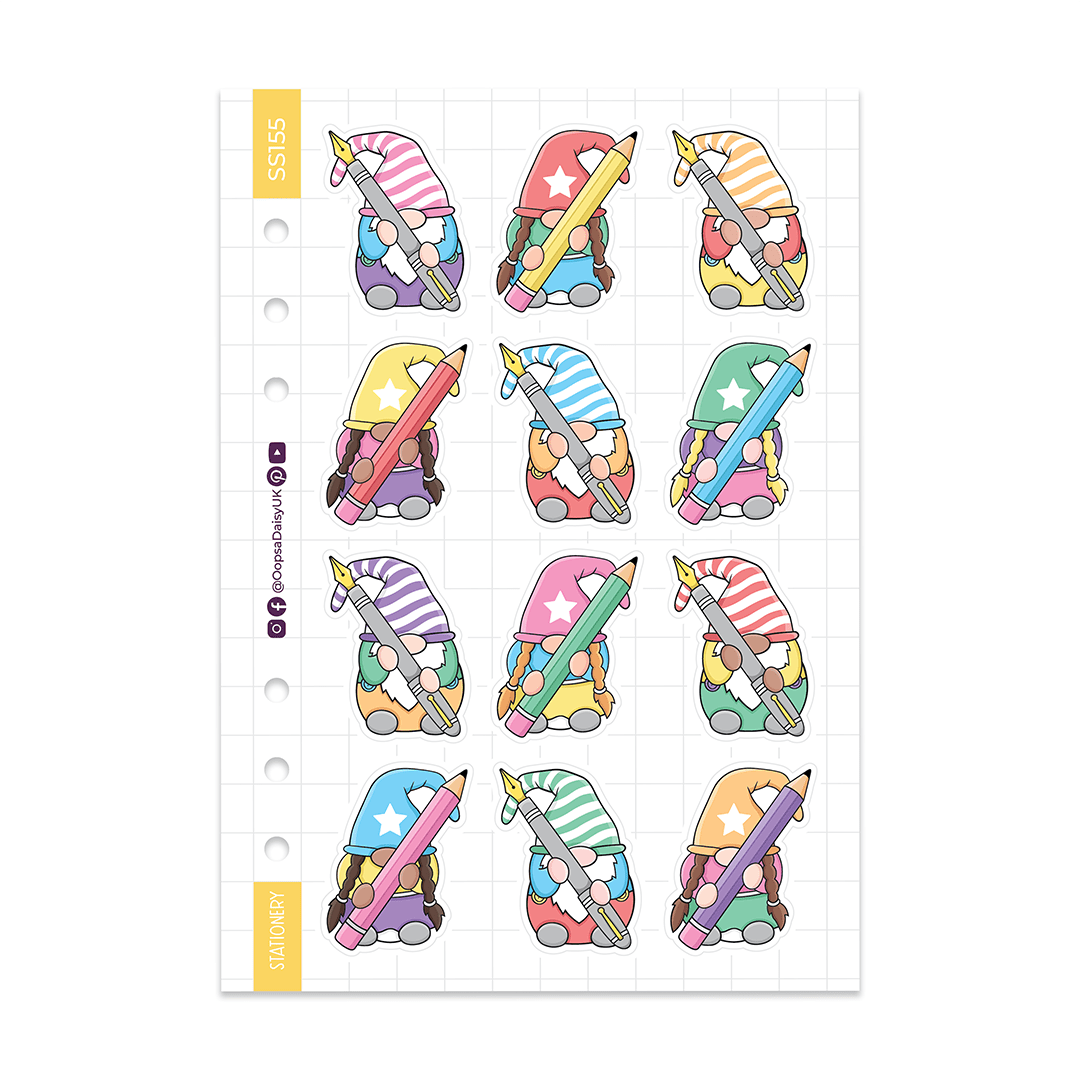 Add a dash of fun to your planner with the Stationery Gonks A5 sticker sheet! This playful set includes 12 charming gnomes holding different pens and pencils, printed on durable matte vinyl for a smooth, non-reflective finish. Sized perfectly on an A5 sheet and punched for easy storage in your 6-ring binder or planner, these stickers are perfect for adding a cheerful touch to your journaling and daily notes.